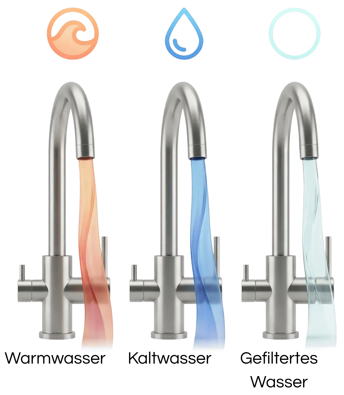 Warm- und Kaltwasser sowie gefiltertes Trinkwasser über eine separate dritte Leitung.