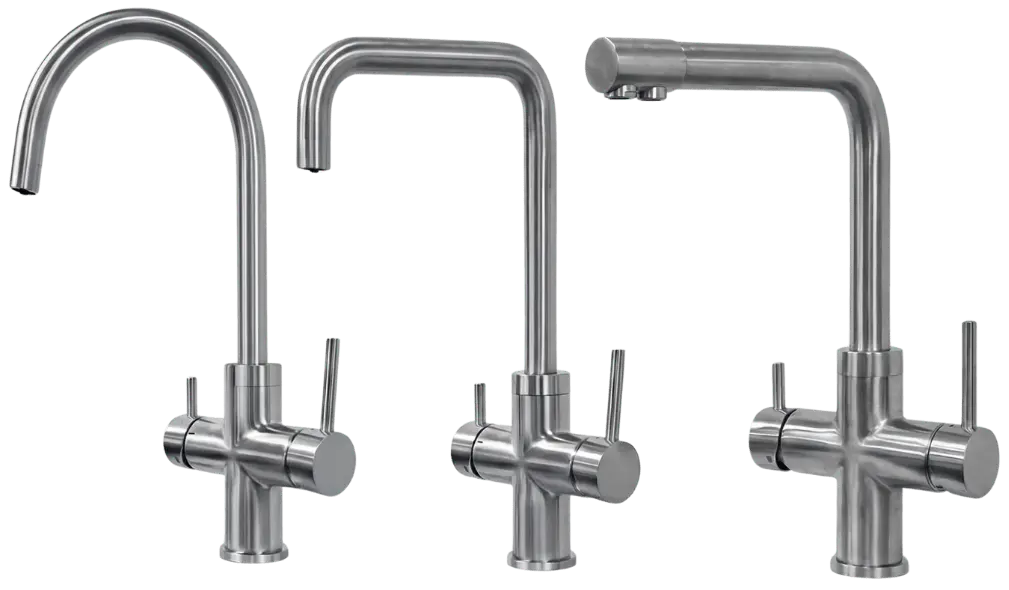 Die GIULIA 3-Wege-Armatur verbindet klassisches Warm- und Kaltwasser mit einer separaten Leitung für gefiltertes Trinkwasser in einem eleganten Design. Erhältlich aus massivem Edelstahl oder hochwertig verchromtem Messing und wählbar in L-, C- oder U-Auslauf. Hygienisch getrennte Wasserwege und langlebige Technik machen sie zur idealen Lösung für moderne Küchen mit Trinkwasserfiltration oder Umkehrosmose.